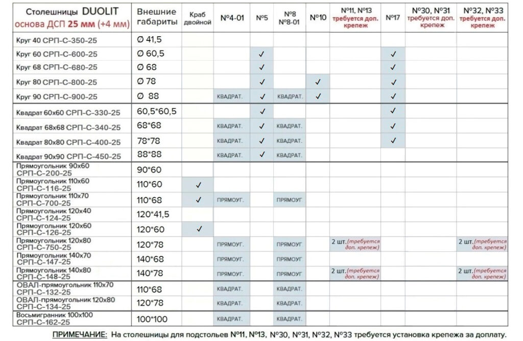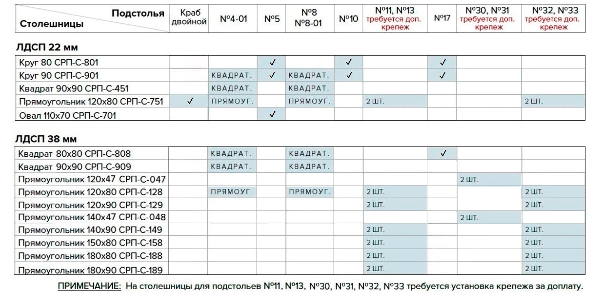 ТАБЛИЦЫ СООТВЕТСТВИЯ СТОЛЕШНИЦ И ПОДСТОЛЬЕВ