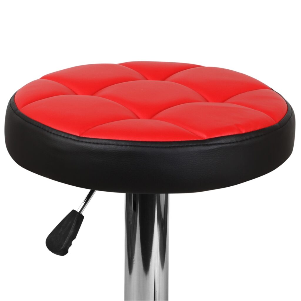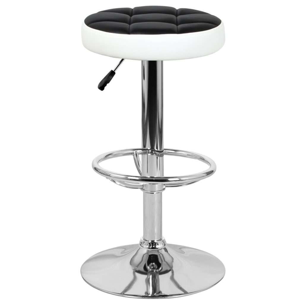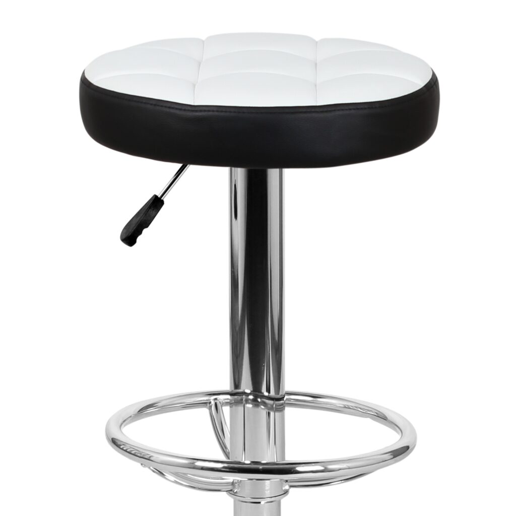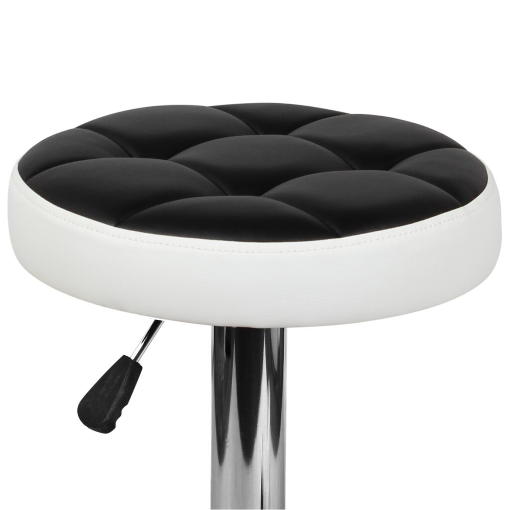 Основание стула представляет собой мощную хромированную стальную опору, закреплённую на прочном плоском диске, что обеспечивает устойчивость при эксплуатации. Сиденье обшито экокожей PVC, практичной в уходе и подходящей для интенсивного использования. Конструкция рассчитана на нагрузку до 90 кг и поставляется с инструкцией для сборки.
