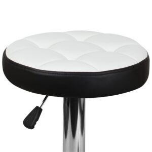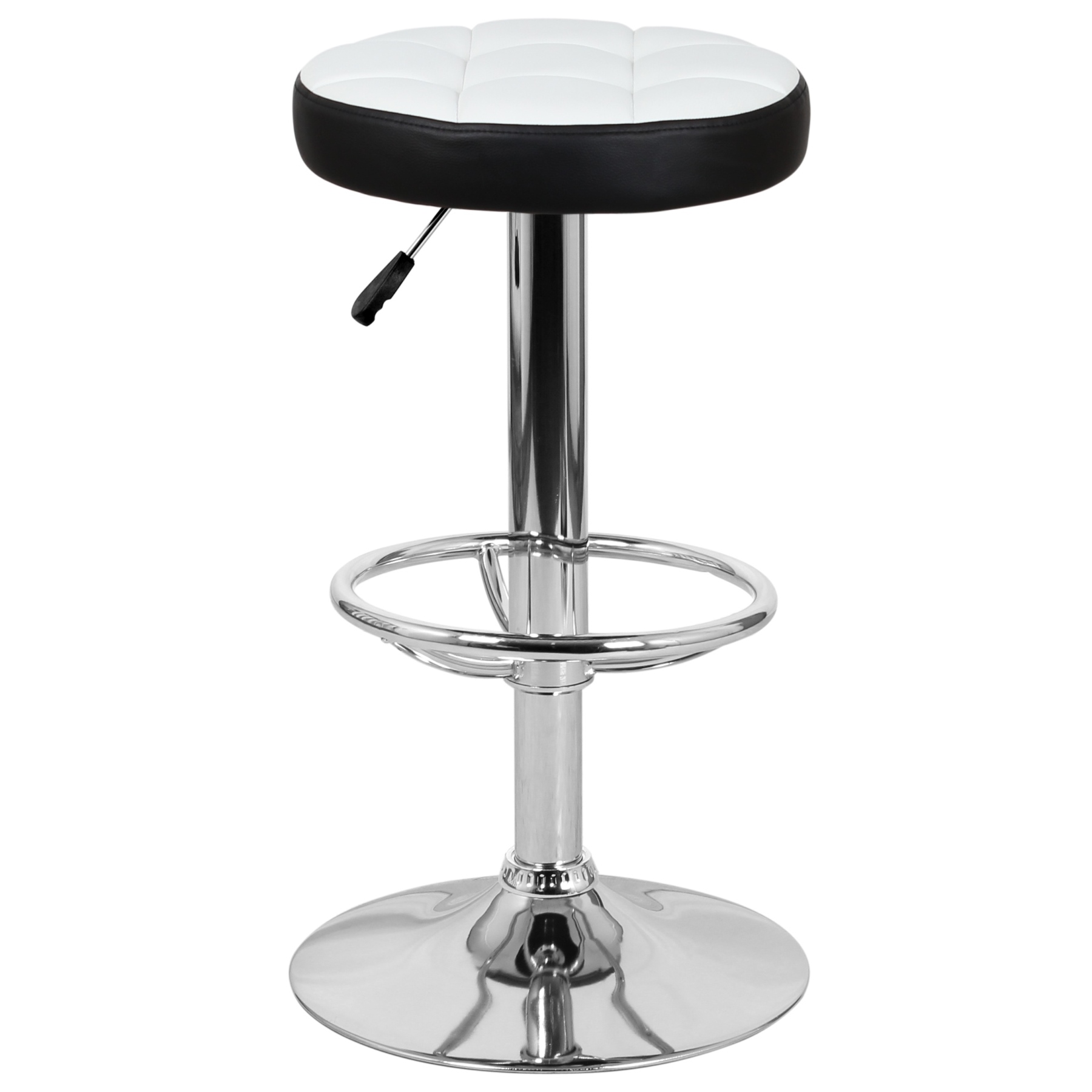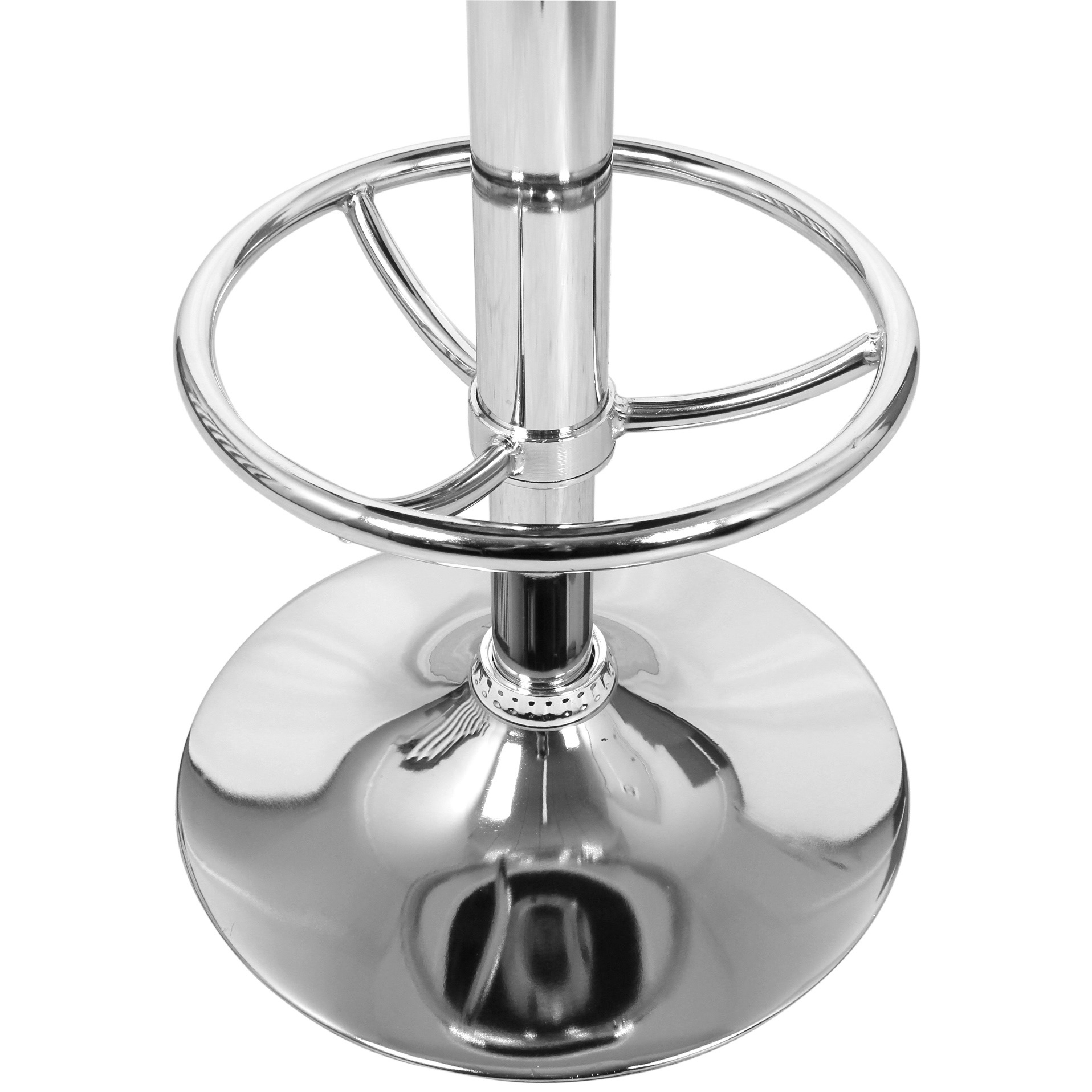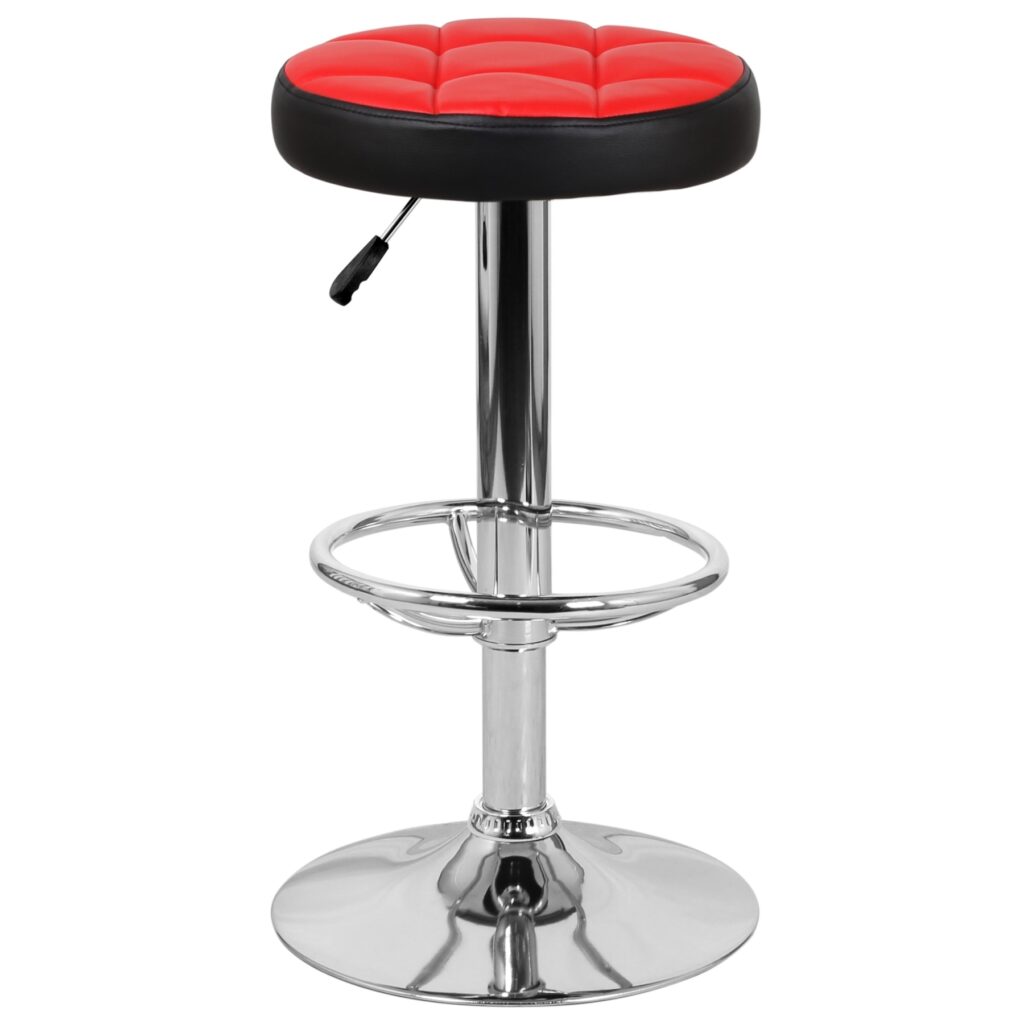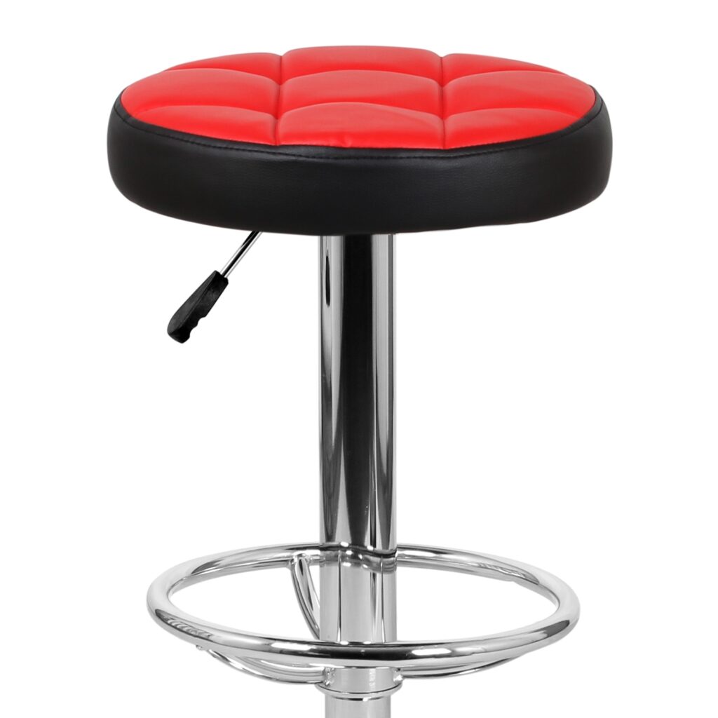 Основание стула представляет собой мощную хромированную стальную опору, закреплённую на прочном плоском диске, что обеспечивает устойчивость при эксплуатации. Сиденье обшито экокожей PVC, практичной в уходе и подходящей для интенсивного использования. Конструкция рассчитана на нагрузку до 90 кг и поставляется с инструкцией для сборки.